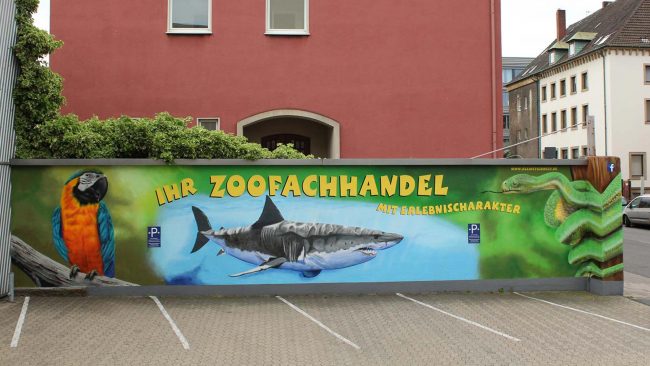 KLEINE TIERWELT Der Zoofachhandel KLEINE TIERWELT suchte nach einem Eyecatcher für die Außenfläche ihres Geschäfts. So beauftragte uns die Inhaberin mit der Aufgabe die etwa 12 Meter lange Wand mit Motiven aus der Tierwelt zu gestalten. Gemeinsam überlegten wir uns welche Tiere auf der Wand zu sehen sein sollten. Um einen Übergang zwischen den verschiedenen…